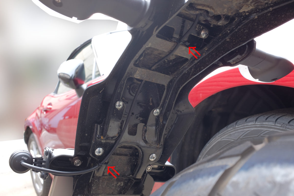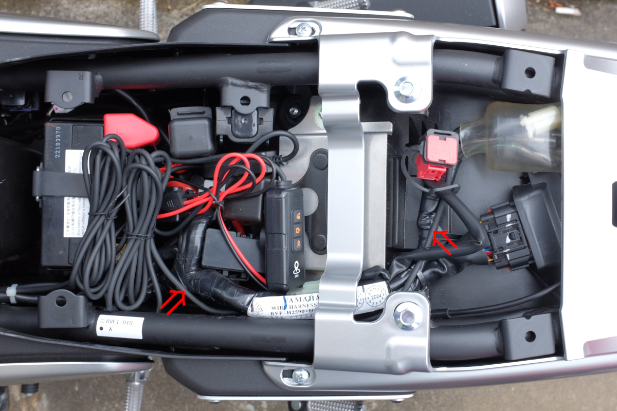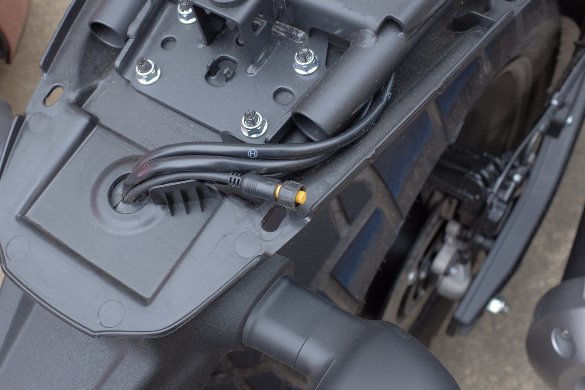 ケーブルはリアフェンダの裏を這わせた。結束バンドにより2箇所で固定し、ド真ん中を通したが砂粒とかが当たって痛むだろうか? でも、上部のグロメット付近にはハナからウィンカのケーブルが出てるし、よしとするか。