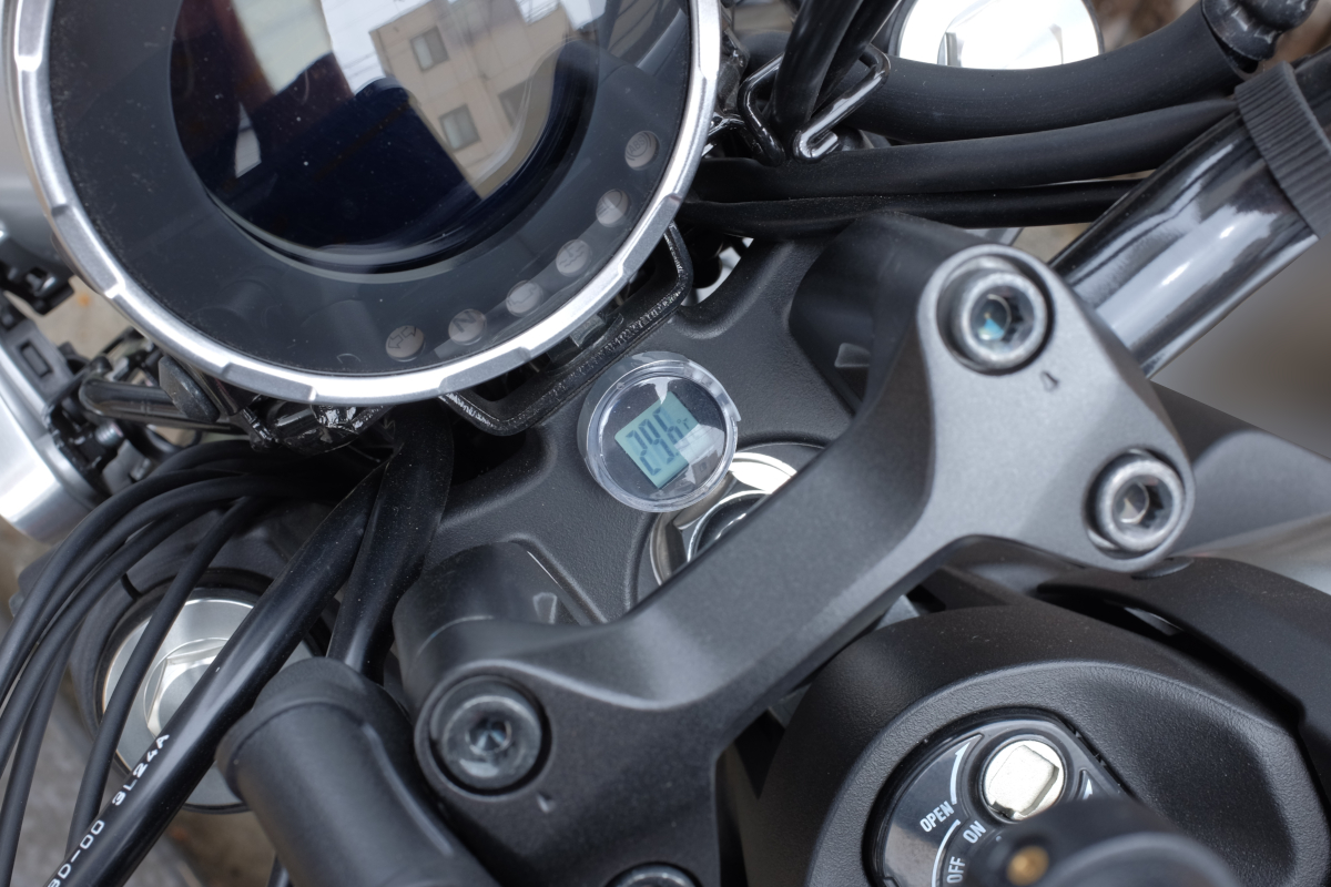 それと、先日に手配した温度計を取り付けてみ……ようとしたが、よい場所がないんだな、これが。フロントブレーキのリザーバの側面も考えたが、液晶の視野角が上に広くないのでイマイチ。結局メータのすぐ下に取り付けたが、乗車中だとだいぶ上からノゾき込む感じでないと見えない。まぁ、そんなに頻繁に見る必要もないからいいんだが……また後日考えよう。