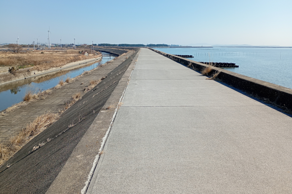 再びスマホで道をチェックする。西ノ浜シーサイドロードを走ってみたいのだ……が、入口は通行止めだった。奥は大丈夫だろうと周り込むと入れた。スゴい。まっすぐ。誰もいない。50km/h前後で走る。ネイキッドはこれくらいがイイのだよね。それを超えると急激にツラくなっていく。