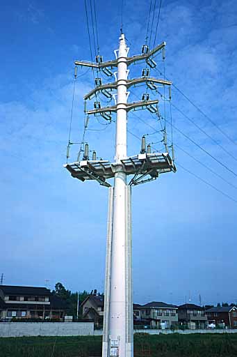 これは上の写真の鉄塔のすぐ次の鉄塔です。実はこの鉄塔は総合病院の敷地内にあります。 「なるほど病院のための電力を供給しているんだな」と考えられますが……ちょっと待って下さい、じゃ、なんでその1本手前の鉄塔が電気を地上へと手渡す「怒り肩」系の鉄塔なのでしょう? 実はこの鉄塔と上の鉄塔との間には道路と川が横切ってます。となると1本手前の鉄塔で地上に降ろされた電線は、川底をくぐって病院に供給されているのでしょうか? そんなことなら、最後の鉄塔を「怒り肩」にすればいいような気がするのですが……。 それとも、この鉄塔の管の中に電線が配置されていて病院へ電力を供給しているのでしょうか? 腕付近の形状の単純さから、そうは考えにくいのですが……。しかし、根元にハッチらしきものも見えるし……。うーむ、よくわかりません。 |