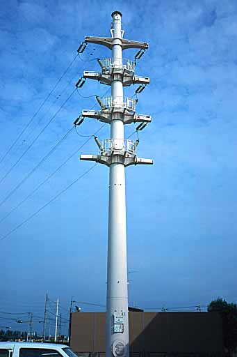 「怒り肩」「交通整理」系の白い管状鉄塔です。特徴は腕で前後に振っているかのような形状です。「はばたいているような」と表現したら言い過ぎでしょうか? よく見ると「腕がはばたいている」のは、下部の踊り場のような場所に電気を渡しているためだと気付きます。そして、渡された電線は踊り場を貫通し、直下でまとめられて管に沿って地上へと送られているようです。 大抵このように電気を地上へと手渡す「怒り肩」系の鉄塔は上部の腕を長くすることで電線同士の接触を防いでいますが、これは「はばたく」ことで接触を防いでいます。効率的ですね。 |