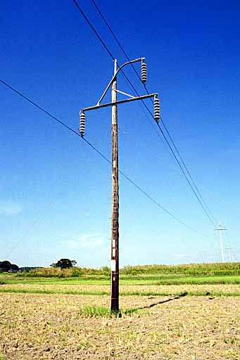 鉄塔ギャラリーの記念すべき50本目の鉄塔はこれ以上ないってくらいシンプルな「シンプル鉄塔」です(そのまんまだケド……)。 よく見れば支柱は「鉄」でなく「木」ですから、正確には「木塔」が正しいのでしょうが、「木塔(ぼくとう)?」でも書いたように、この鉄塔ギャラリーでは、これは鉄塔だということにしています。あしからず。 見れば見るほどシンプルな鉄塔なのですが、注目すべきはその頭。後付けのようですが、ちゃんと落雷除けの「空中地線」が張られています(木なのに大丈夫なのかは別として)。 |