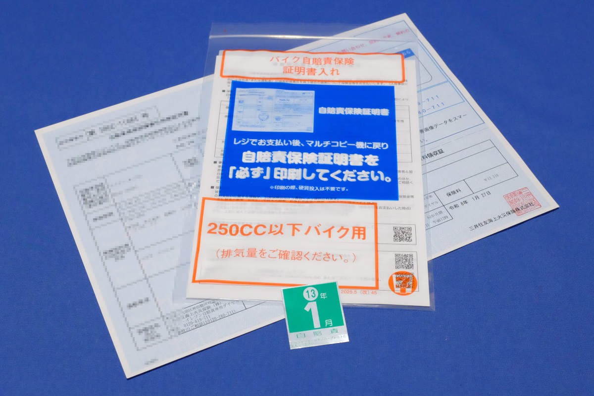 さて、ナンバが手に入ってもまだやることはある。自賠責保険への加入だ。最近ではコンビニで手続きできるらしい。レジで料金を支払い、その場で証明書が印刷され、ステッカーがもらえる……というけれど、これ、絶対にレジで処理方法がわかんなくてモメるやつじゃねーかな……。