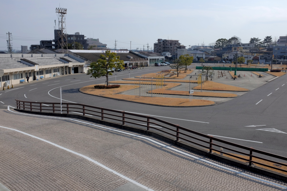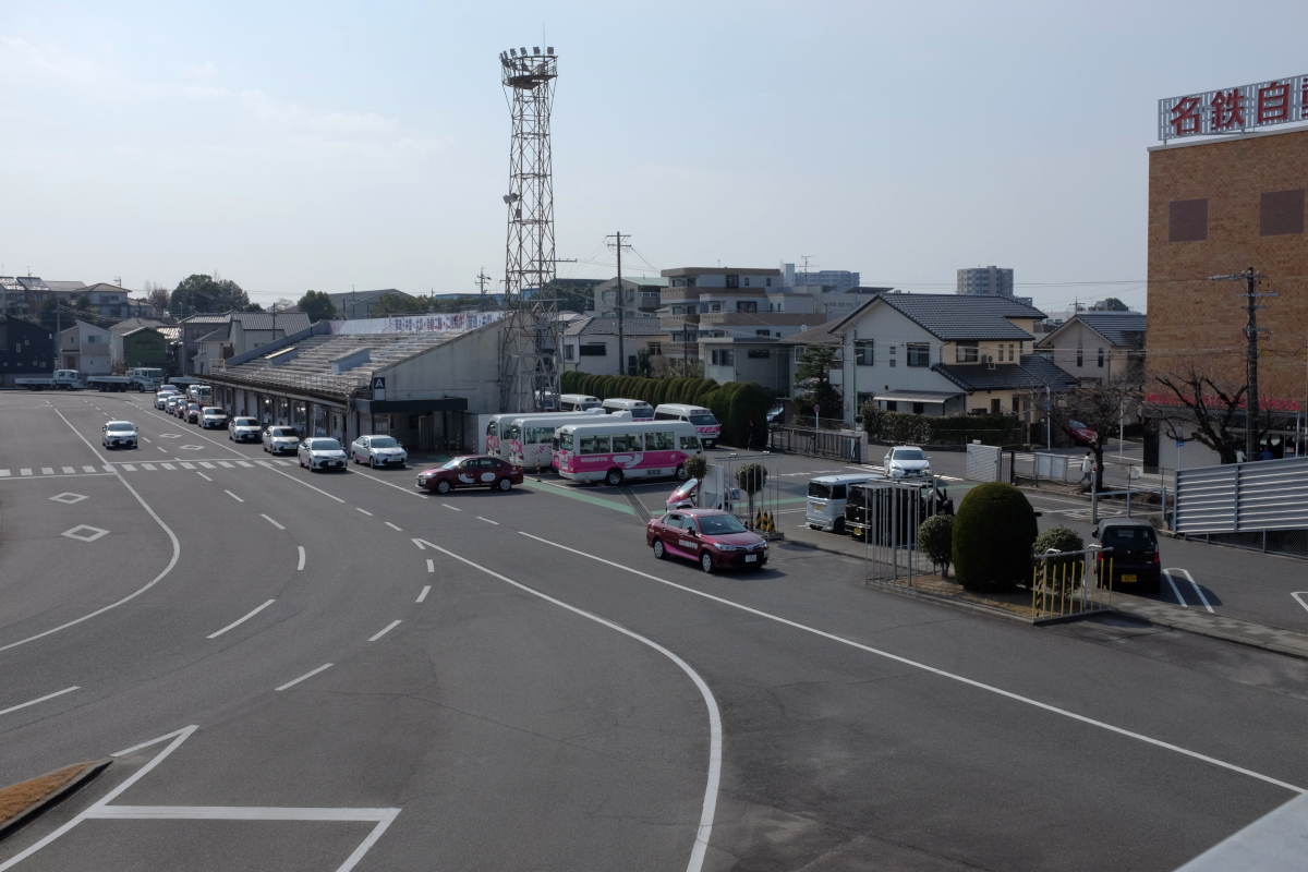 できれば観戦席の上から応援したかったのだが、立ち入りは禁止のようだ。しゃーない。球場……じゃなくて、教習所の周りを一周する。観戦席の下は現在も事務所や車庫として活用しているようだ。名鉄って鉄道事業でもちょっとそういうトコ(?)あるのよね。オモロいなぁ。
