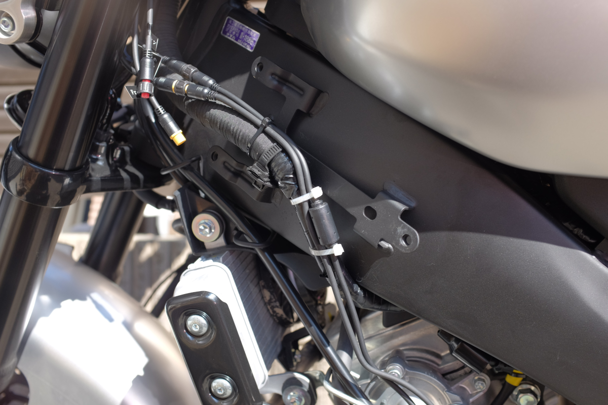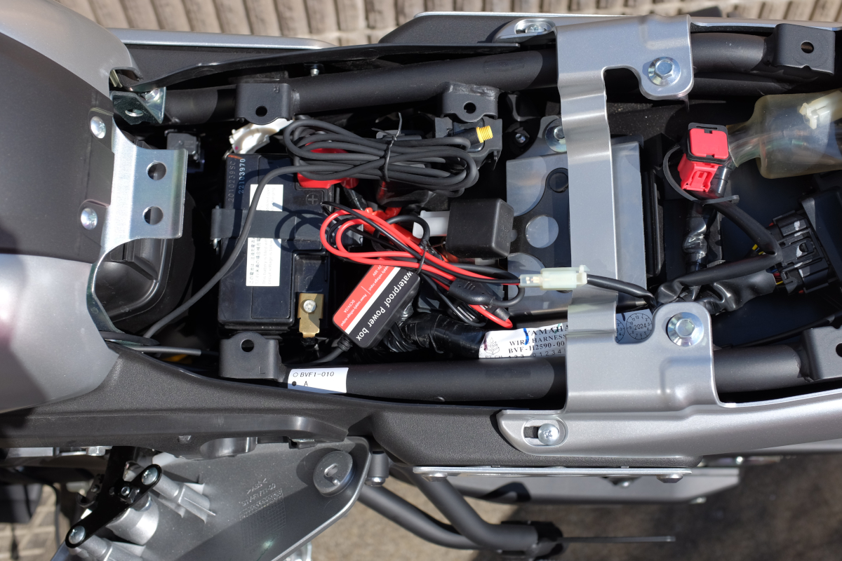ドラレコのカメラの設置も必要なのだが、それは次回ということで、今回はあくまで仮設置。左のアッパーサイドカバーだけ外してできるところまで、というつもりだったが、左のエアースクープを外したら、その下にだいぶキレイに配線できてしまった。スマートモニタの電源線も意外と電源ボックスの先が長く、シートの下にボックスを収めることができた。ついでにリアのドラレコのカメラも延長分だけ配線だけしておくか。思った以上にキレイに収まったな。