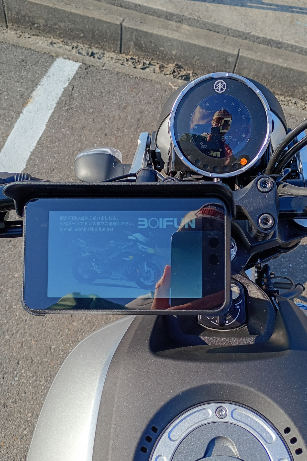 そして問題はモニタの設置。個人的に絶対にメータにかからないようにしたいし、空気抵抗をモロに受ける感じにはしたくない、と思っていたのだが、ハンドルの根っこ近くにいい感じに取り付けることができた。まだ仮設置だが、これはいい位置だな。これなら操作に影響するイナーシャモーメントも小さいし。画面は水平に近いからヒサシはいらんな。それでも十分に明るく見やすい。