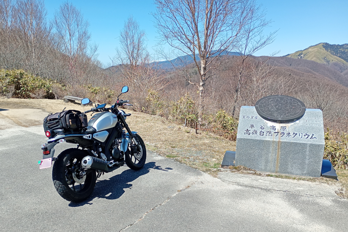 平谷の先で高嶺山に向かう道を発見。先日に行ってみたい候補に入れた場所だったので向かってみることに。落ち葉や砂利など、ちょっとバイクにはキビしい道だったが手頃な場所だった。しばらく走って展望台へ到着。なかなかの眺望だ。少し散歩して戻る。どうも、林道は今日からオープンだったらしい。それは奇遇な。
