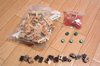 で、ワクワクしながら、日米で買ってきたジャンク袋をチェックする。中身はほとんどが受動部品。嵩で概ね、1/4が抵抗、1/4がコンデンサ、1/4がダイオード、1/4がチップ部品その他であった。抵抗は妙に8.2kΩのモノが多く偏りはあったが、それなりにバラエティに富んだ配合であった。抵抗とコンデンサについては紙に種類をメモしつつ、上記を4つの袋に分けて保存。これはオイシかった。
