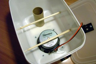 先日、ちゃんとしたスピーカに比べると、エンクロージャの強度の違いを感じると書いたが、ほんじゃ、補強してやればいいじゃないか、と、タッパー内部に2本の柱を立ててみた。ここまで来たら、徹底的に金を掛けないことにコダわってみる。材料は、手元にあった割り箸とボンドである。まさに「おてもと」の部品を用いた工作である。
